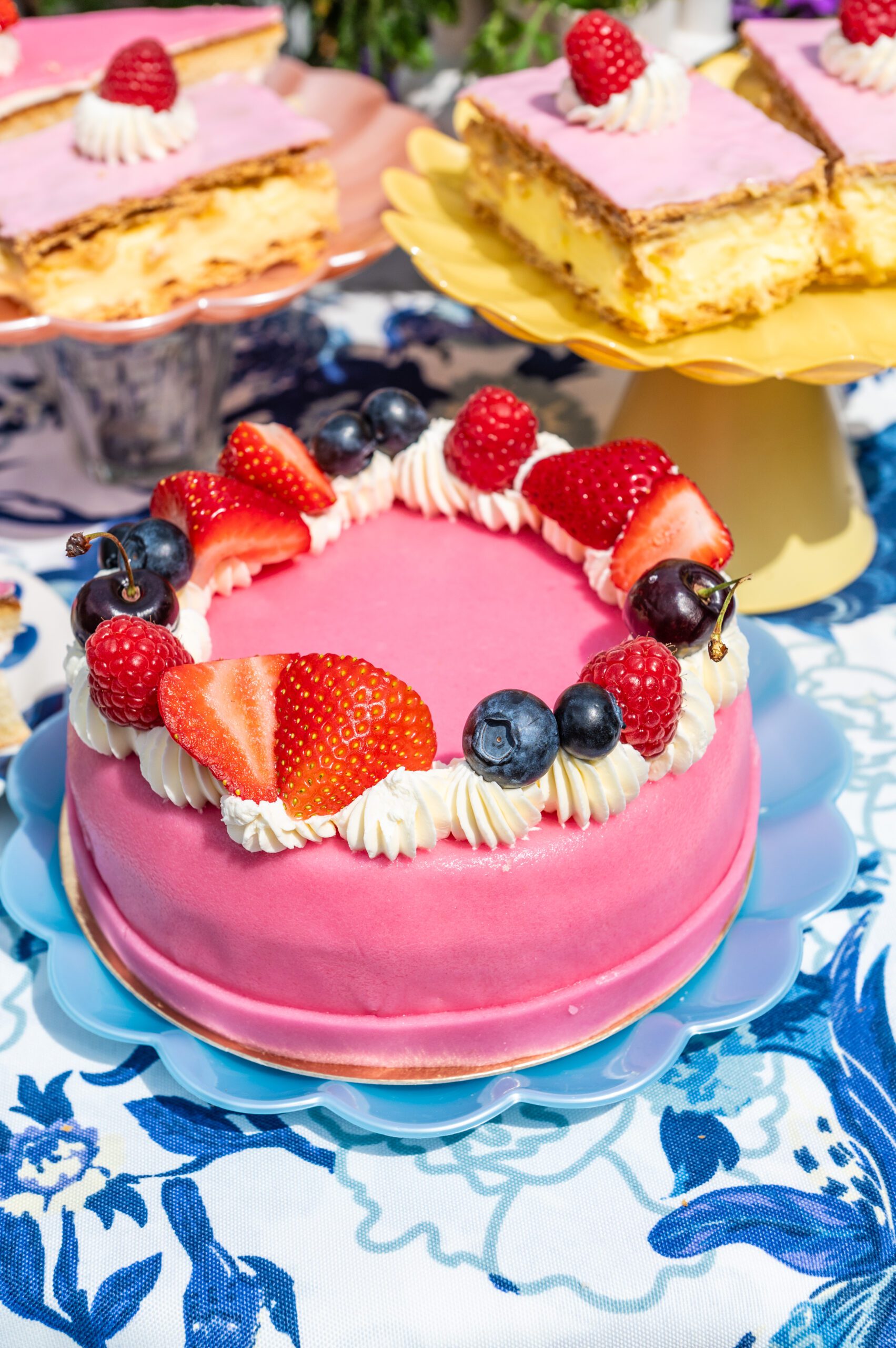 Een heerlijke naturelcake gevuld met een aardbeibavaroise en omhuld met het allerlekkerste marsepein.